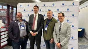Dawson Creek’s mayor, Darcy Dober and councillors Kyle MacDonald and Mike Sudnik with B.C. Premier David Eby at the BC Natural Resources Forum 2026 in Prince George. (City of Dawson Creek – Mayor’s Office/Facebook)