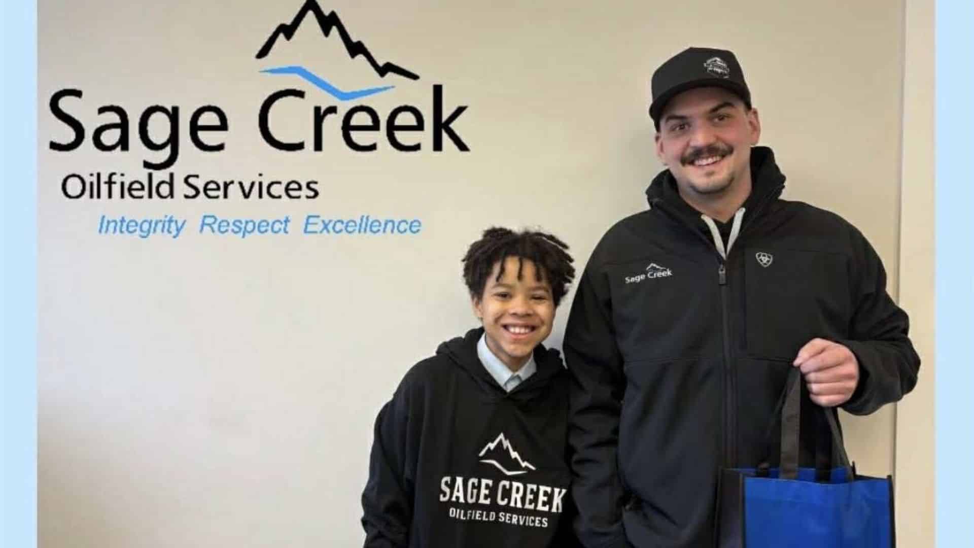 Young Josiah Ojokojo received a $1,500 sponsorship for his soccer tournaments from Sage Creek Oilfield Services this week, which included a picture with equipment manager Eric Lister (photo submitted by Brittany Mycock)