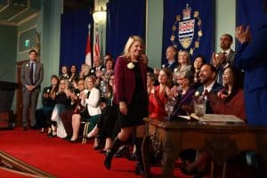 Premier David Eby looks on at Minister for Child Care and Children and Youth with Support Needs Jodi Wickens during the swearing-in ceremony at Government House in Victoria, Monday, Nov. 18, 2024. THE CANADIAN PRESS/Chad Hipolito