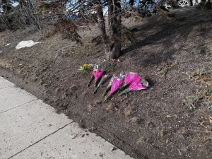 Flowers are being laid outside Tumbler Ridge Secondary School. (Ed Hitchins, Energeticcity.ca)