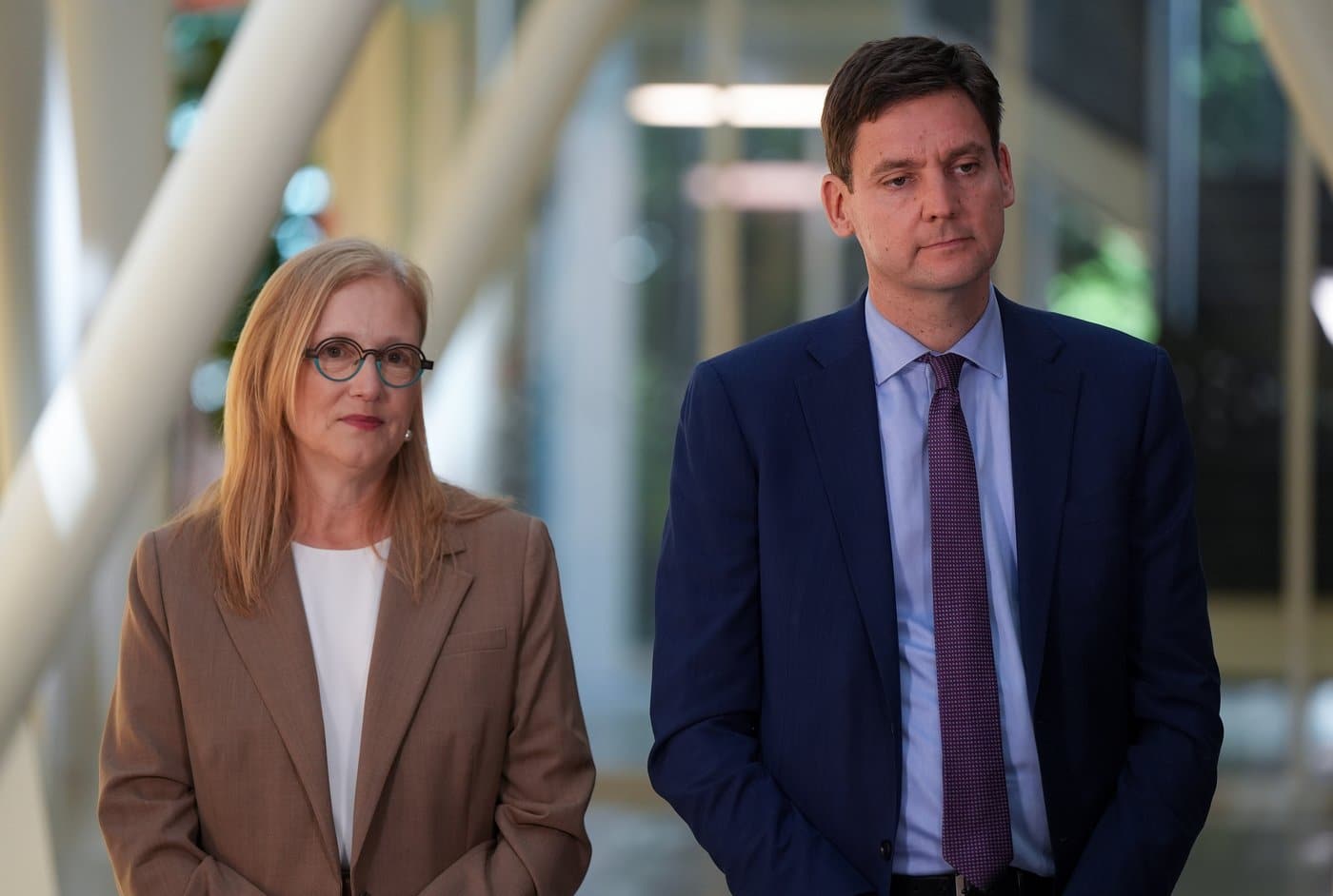 B.C. Premier David Eby, right, and Finance Minister Brenda Bailey, left, listen during an announcement about increasing the tax credit for game developers, at Electronic Arts in Burnaby, B.C., on Monday, July 7, 2025. THE CANADIAN PRESS/Darryl Dyck