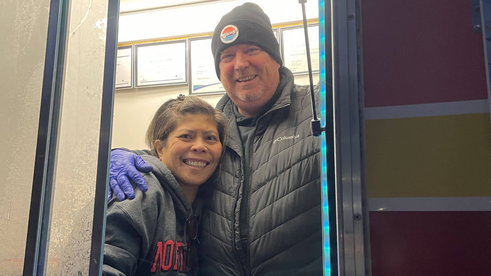 Rob Weatherbee and Mona Rendon, owners of Sippin’ Stable, giving out free hot chocolate at Winter Fest 2026 finale on February 16th. (Areli Nuñez, Energeticcity.ca)