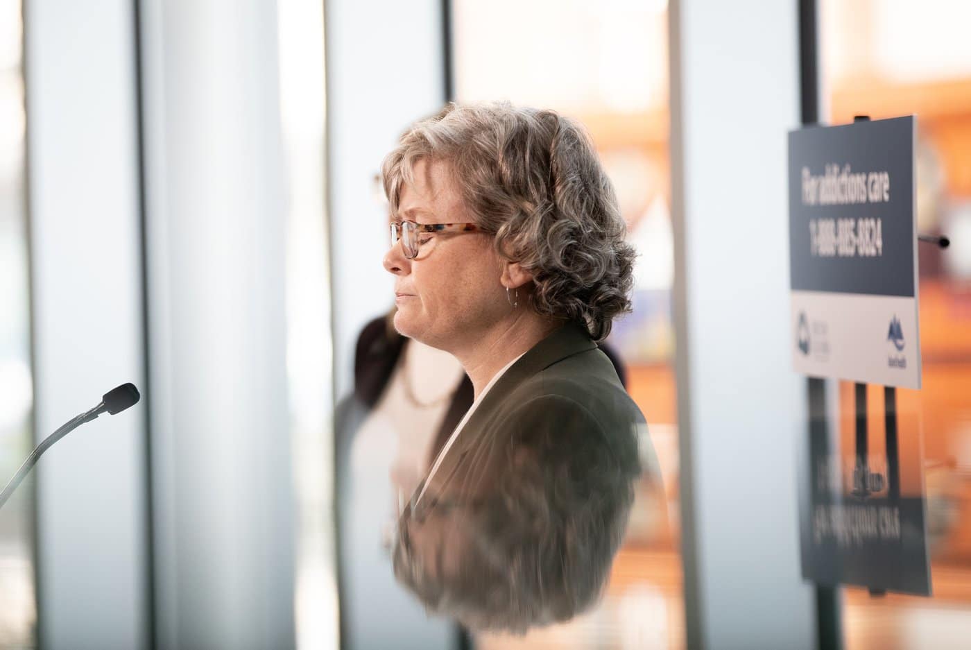 Health Minister Josie Osborne pauses as she provides an update about addictions care and the end of the decriminalization pilot project at the Royal Jubilee Hospital in Victoria, on Wednesday, Jan. 14, 2026. THE CANADIAN PRESS/Chad Hipolito