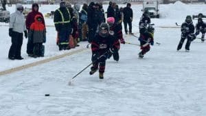 Amid windy conditions, youth suited up to play in the Sid Davis Memorial Tournament on February 22nd (Crystal Cup Pond Hockey Challenge, Facebook)