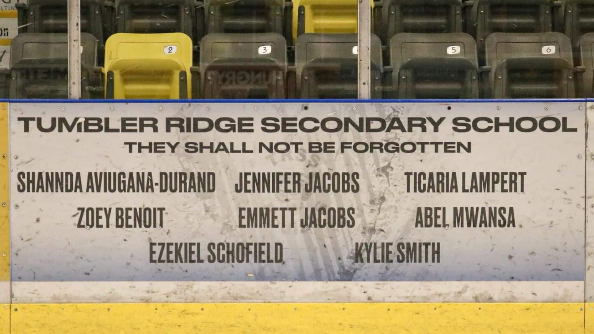 An end board displaying the victims of the Tumbler Ridge shooting will be in the Coquitlam Express’ home arena for the remainder of the BCHL season (Coquitlam Express/Facebook)