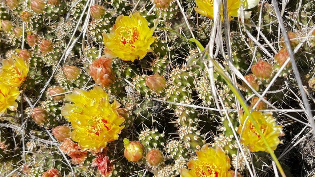 The south-facing hillsides here in the valley are home to prickly pear cactus that briefly flower normally around July 1st.