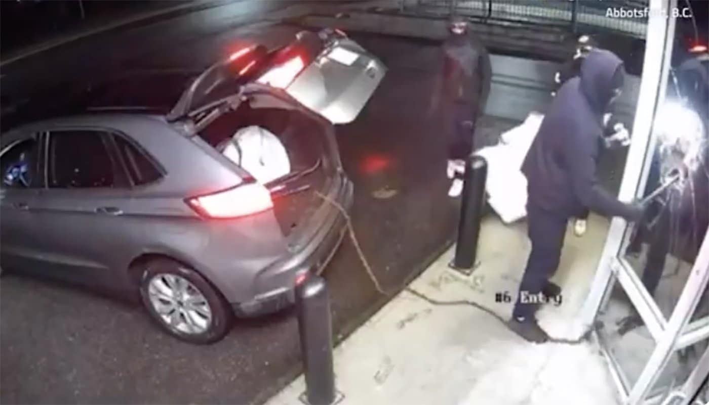 This image from a security video shows thieves targeting the House of Cards store in Abbotsford, B.C., in the early hours of March 6, 2026. The thieves made off with Pokémon trading cards worth about $30,000.THE CANADIAN PRESS/Handout – House of Cards (Mandatory Credit)