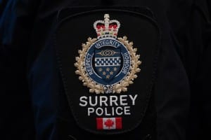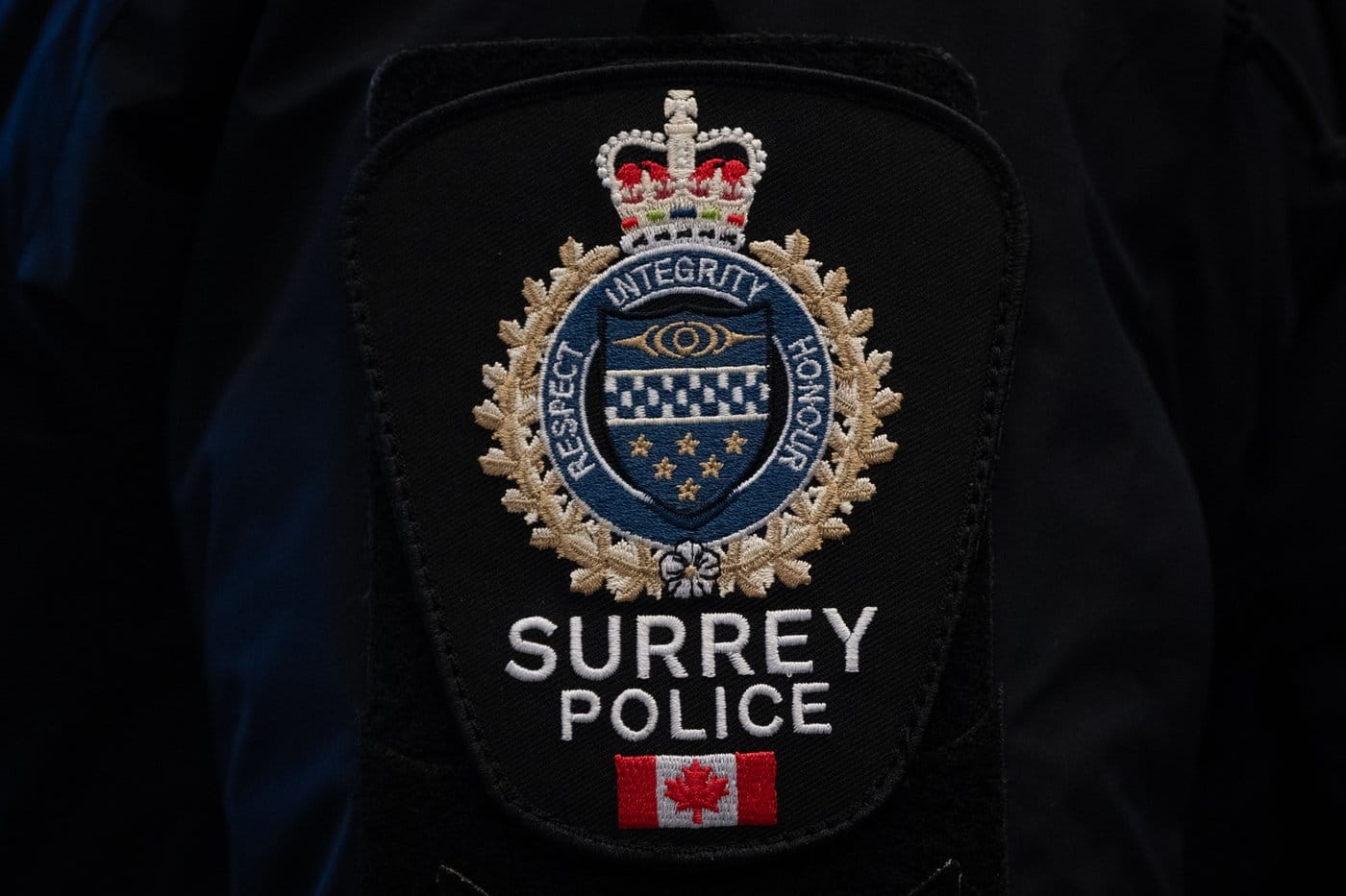 A Surrey Police patch is worn by an officer at RCMP “E” Division headquarters in Surrey, B.C., on Thursday, Feb. 19, 2026. THE CANADIAN PRESS/Ethan Cairns