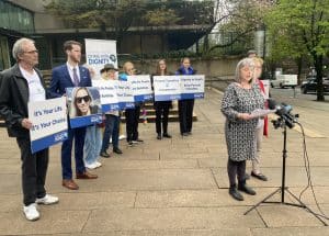 Law professor Daphne Gilbert with Dying With Dignity Canada speaks to reporters outside B.C. Supreme Court in Vancouver on Monday, April 13, 2026. THE CANADIAN PRESS/Darryl Greer