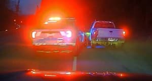 A pickup truck, right, that Salmon Arm RCMP stopped on Highway 97A, on Sunday, March 29, 2026, is shown in this handout photo. THE CANADIAN PRESS/Handout – Salmon Arm RCMP (Mandatory Credit)