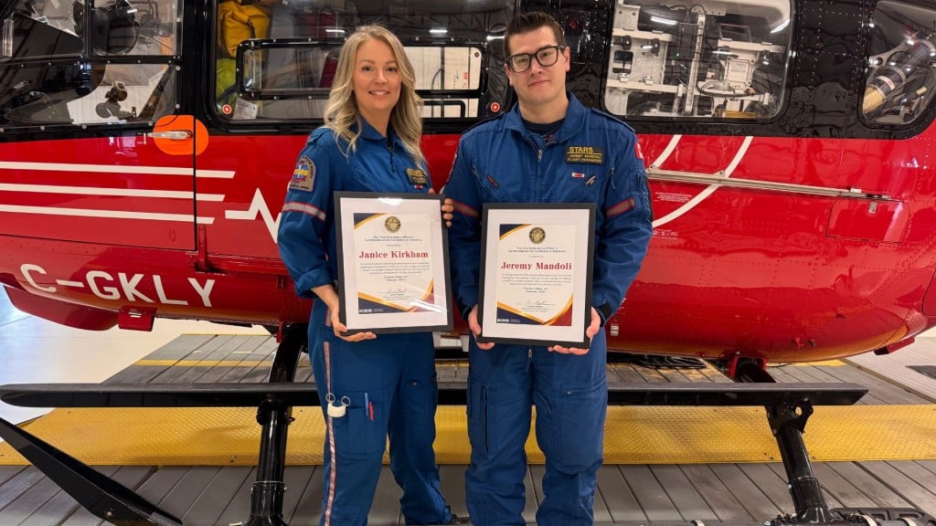 The Chief Ambulance Officer’s Commendation for Excellence in Adversity award was presented to two Grande Prairie STARS members, flight nurse Janice Kirkham and flight paramedic Jeremy Mandoli, on April 14th in a ceremony in Alberta.