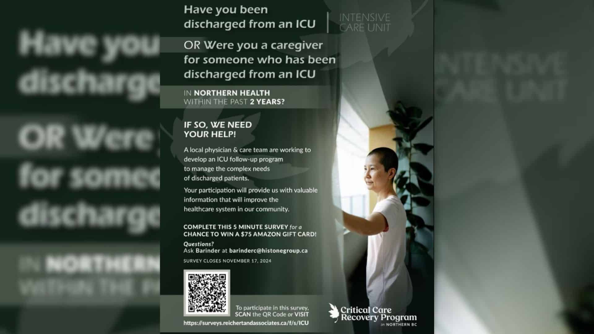 The Northern Health Authority has launched a survey for people discharged from their Intensive Care Units (ICUs) or caregivers of those patients in the Northern Health region in the last two years.