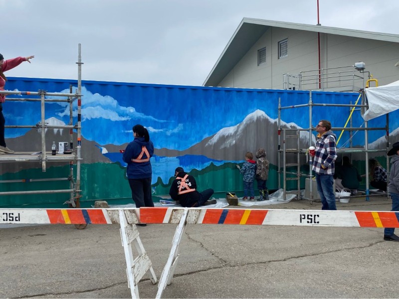 Fort Nelson evacuees have begun painting a mural on the side of a shipping container in the North Peace Arena parking lot.
