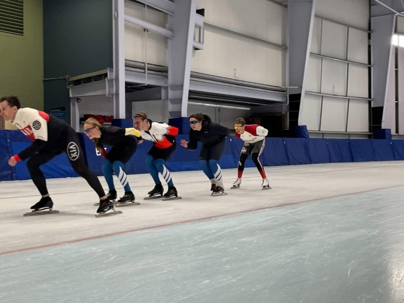 Olympic medalist gets some ice time with local speed skaters